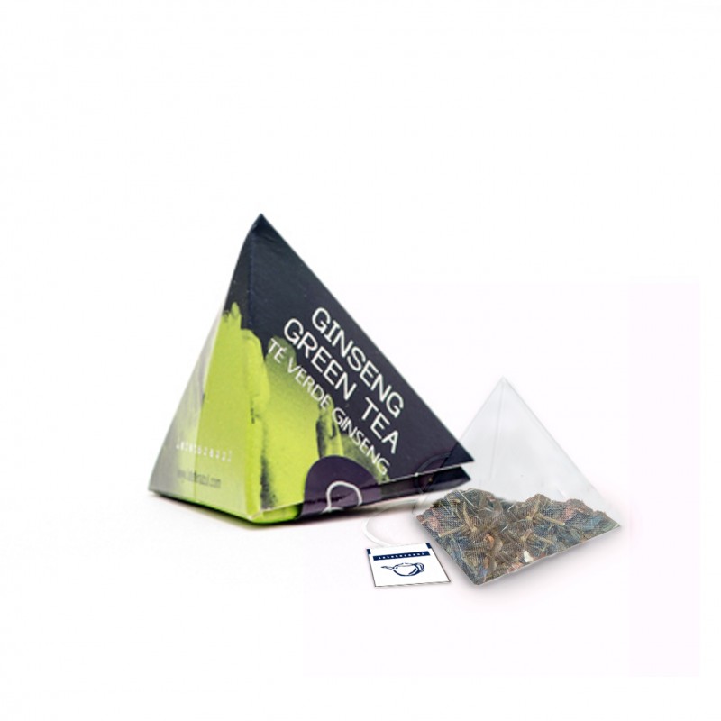 Green Tea Ginseng Unit pack: Pyramid-shaped cardboard box containing 1 pyramid-shaped sachet of 2.0 g. net of product. An ideal infusion format for the catering trade.