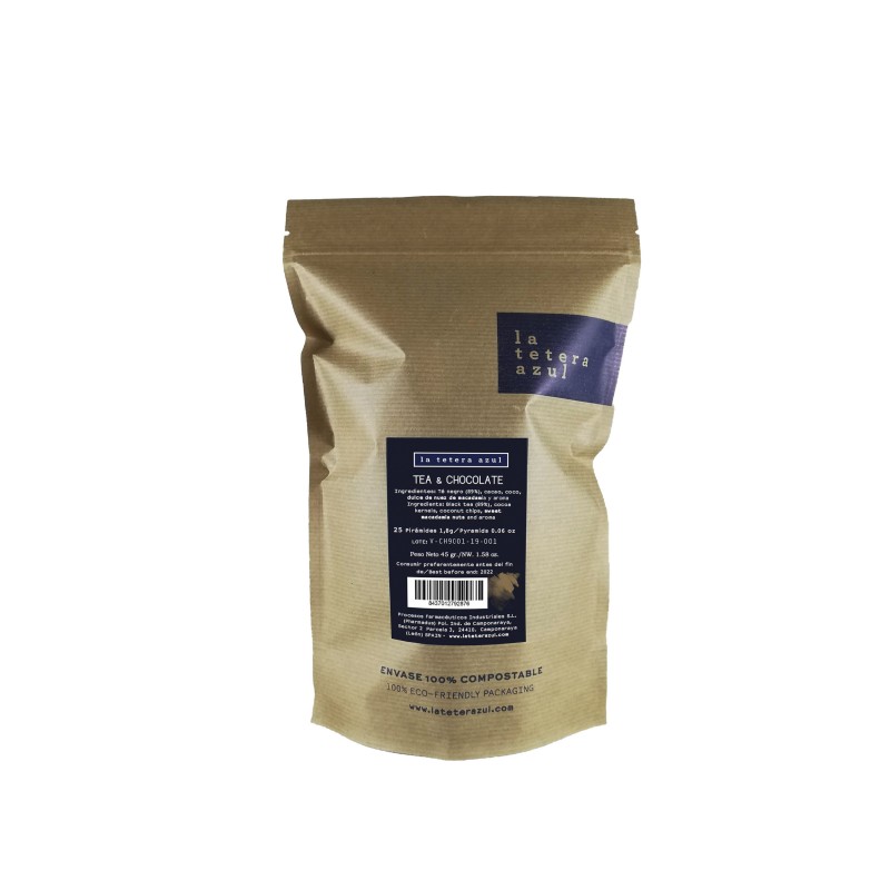 Pyramidal bags: Introduce a Tea & Chocolate Premium bag of La Tetera Azul in a cup and add water (150-200ml) to the boil. Cover and let stand 5 minutes. Remove the bag and sweeten if desired to taste.