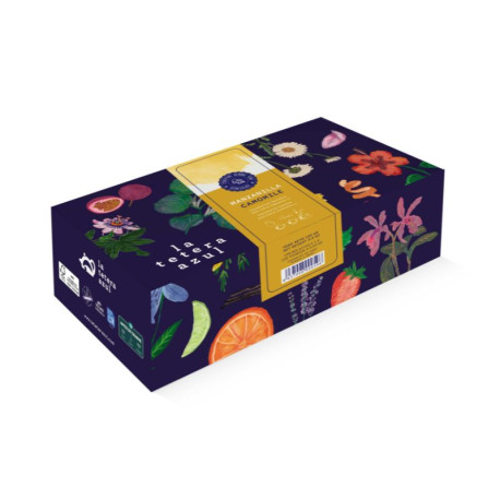 Manzanilla de la mejor calidad de La tetera Azul que mantiene intactas todas sus propiedades medicinales. Cada caja de Manzanilla de La Tetera Azul contiene 100 bolsitas filtro de 1,0 g. de peso neto, de papel de filtro plegado con hilo de algodón y etiqueta cosidos. Cada bolsita de manzanilla se presenta en sobre termosellado de papel mate. Todas las infusiones de La Tetera Azul son sometidas a estrictos controles de calidad, para que disfrutes de todo su aroma y sabor, sin deteriorar ni adulterar la materia prima.