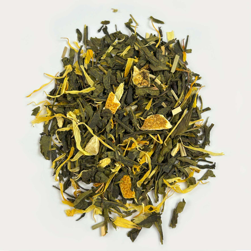 Té verde, hierba limón, cáscara de limón, piña, pétalos de caléndula y aroma.