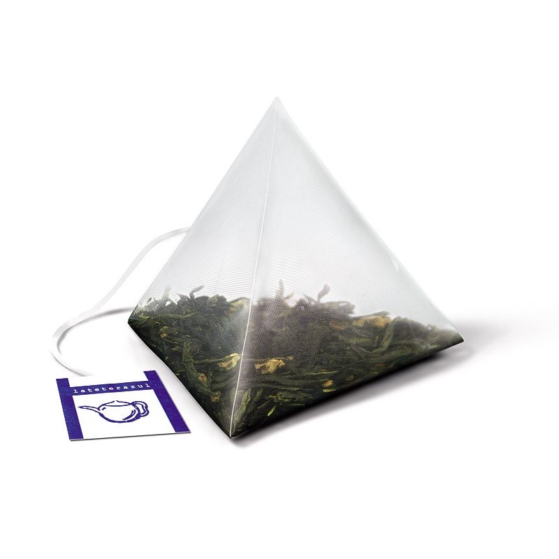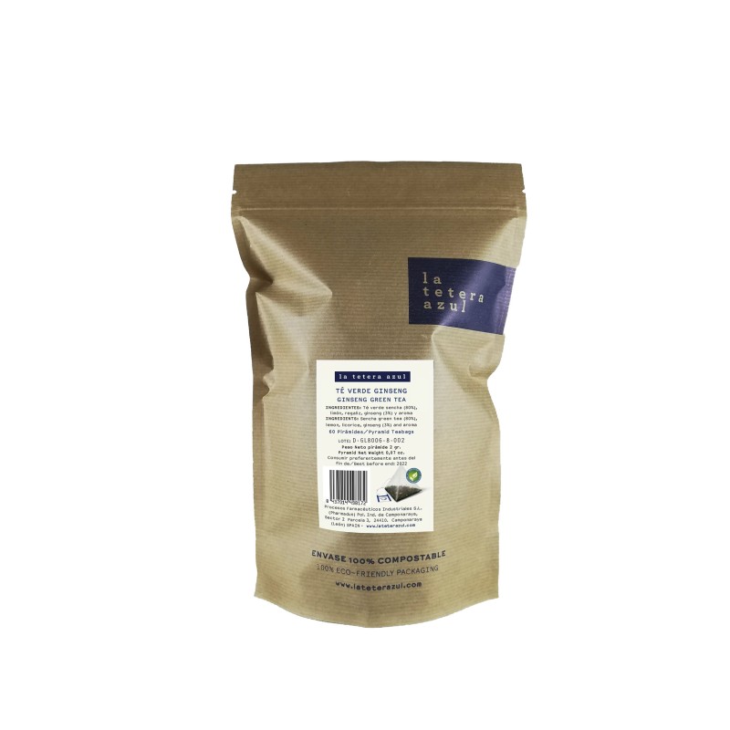 El material con el que están elaboradas las pirámides de Té Verde Ginseng es un derivado de almidón de maíz, que es biodegradable. Por lo cual no es necesario separar la bolsita de su contenido a la hora de tirarlo a la basura, todo el conjunto se puede tirar en el cubo de material orgánico ya que es biodegradable.